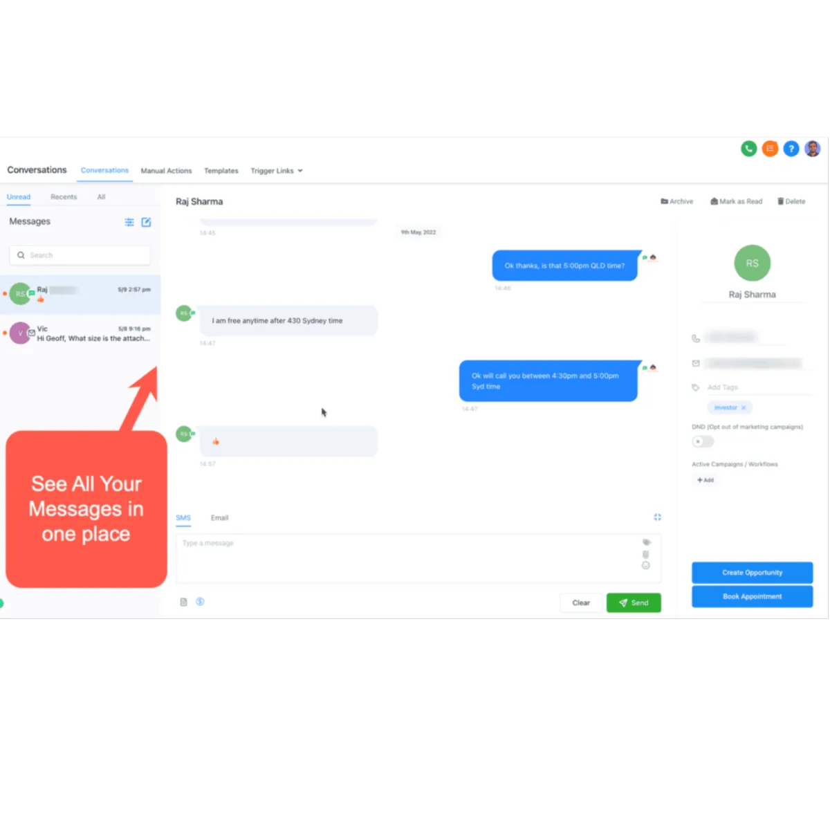 Establish connections with leads and clients through various channels, including texting, live chat, bulk messaging, Google My Business, and Facebook messages.